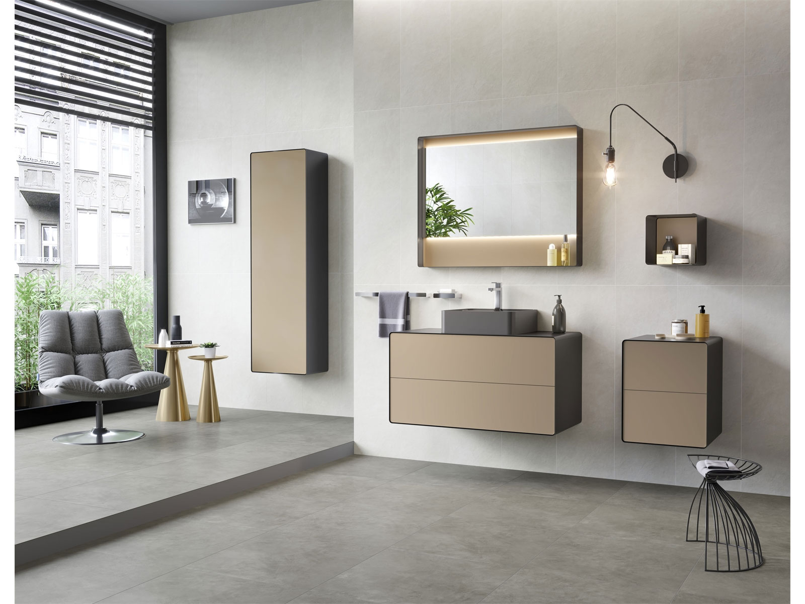 Tamamlayıcı açık rafları ve çekmeceli yan modülü ile genişleyen mobilyalara sahip olan seri; geniş depolamalı boy dolabıyla, bas-aç çekmecesiyle ve metal-sinterflex-ahşabın birlikte kullanımıyla ön plana çıkıyor.